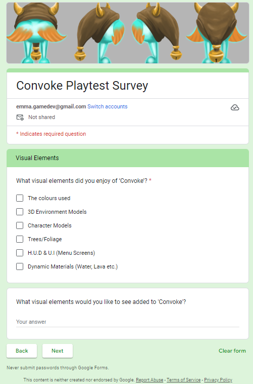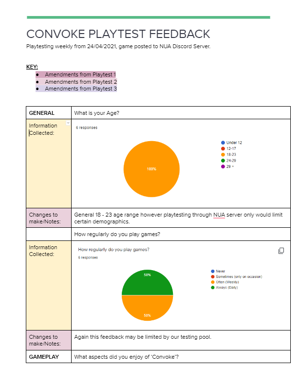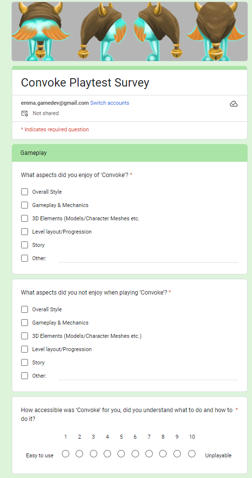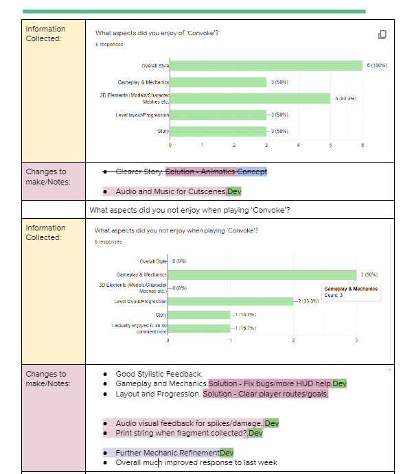 Another responsibility of mine was overseeing playtesting and collating the feedback for the team. As I was the only team member from Indie Development I felt comfortable playtesting and collecting feedback I used Google Docs and Google Forms to collect feedback and hosted the in0development game via my itch.io page.