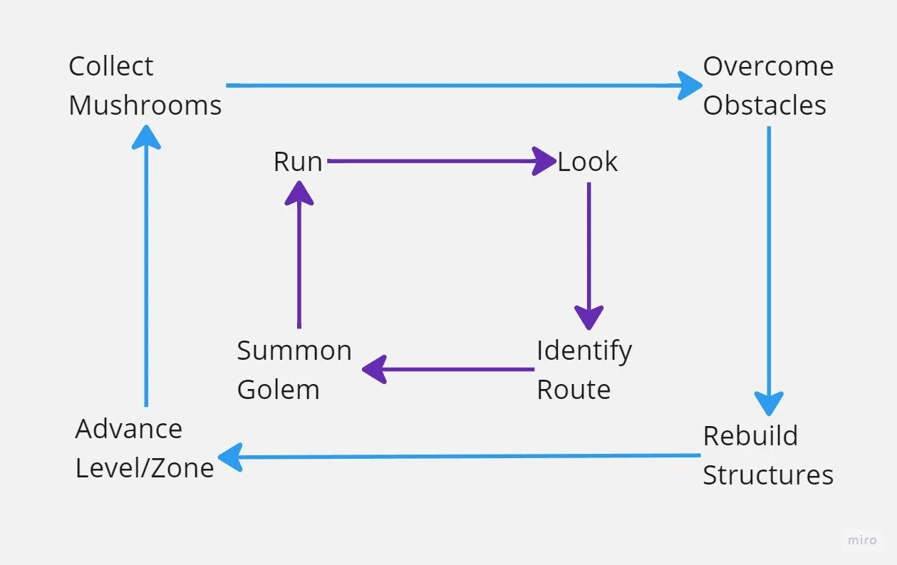 My first steps were to research, create a moodboard and begin developing potential gameplay loops. I used Miro, Notion and Photoshop for all of my preparatory work.